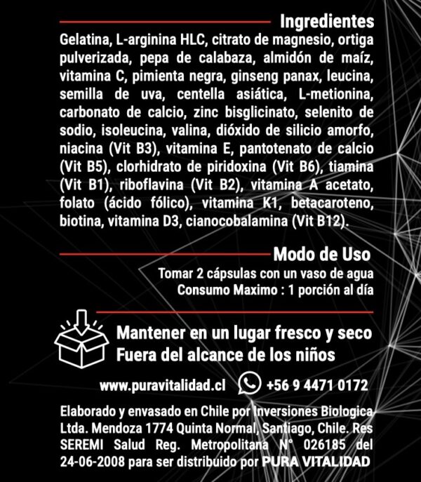 Gelatina, L-arginina HLC, citrato de magnesio, ortiga pulverizada, pepa de calabaza, almidón de maíz, vitamina C, pimienta negra, ginseng panax, leucina, semilla de uva, centella asiática, L-metionina, carbonato de calcio, zinc bisglicinato, selenito de sodio, isoleucina, valina, dióxido de silicio amorfo, niacina (Vit B3), vitamina E, pantotenato de calcio (Vit B5), clorhidrato de piridoxina (Vit B6), tiamina (Vit B1), riboflavina (Vit B2), vitamina A acetato, folato (ácido fólico), vitamina K1, betacaroteno, biotina, vitamina D3, cianocobalamina (Vit B12).